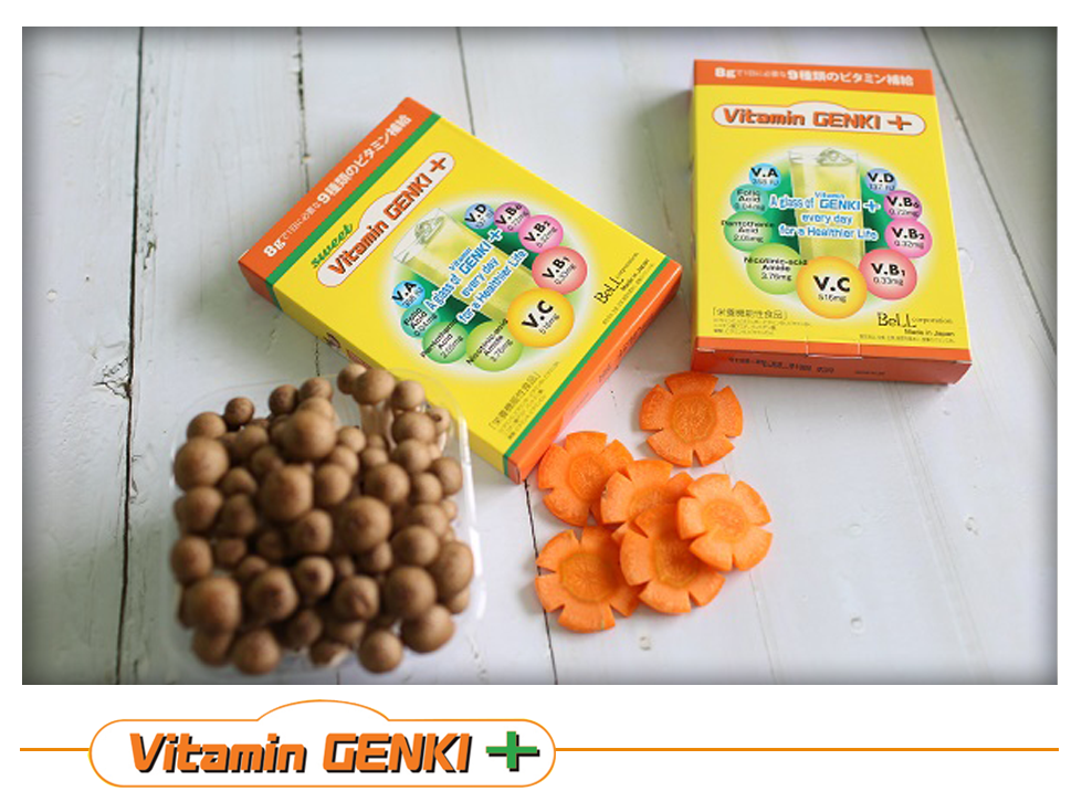 Trong 8g  Vitamin GENKI+ có đến 9 loại Vitamin được tinh chiết dựa trên tiêu chuẩn về dinh dưỡng bổ sung cần thiết cho cơ thể mỗi ngày: Vitamin A, Vitamin C, Vitamin D3, Vitamin B1, Vitamin B2, Vitamin B6, Nicotinic Amide Acid (Vitamin B3), Pantotheni Acid (Vitamin B5),  Acid Folic (Vitamin B9).